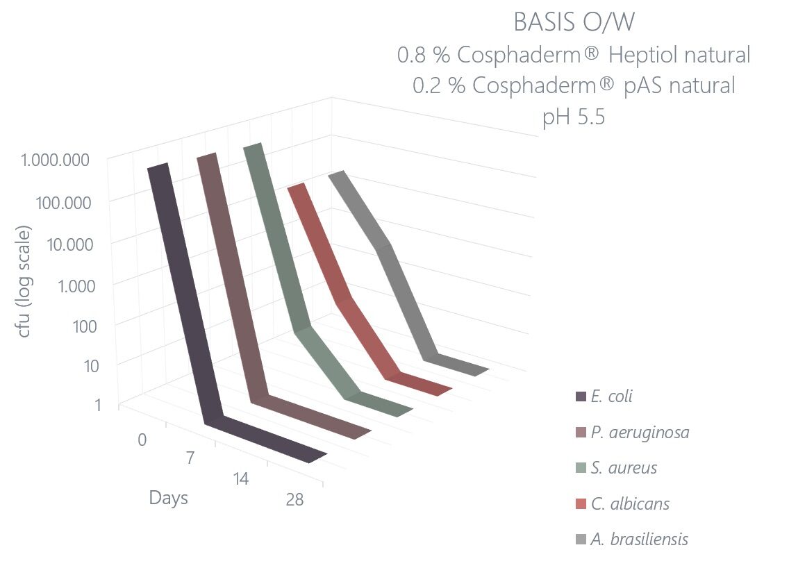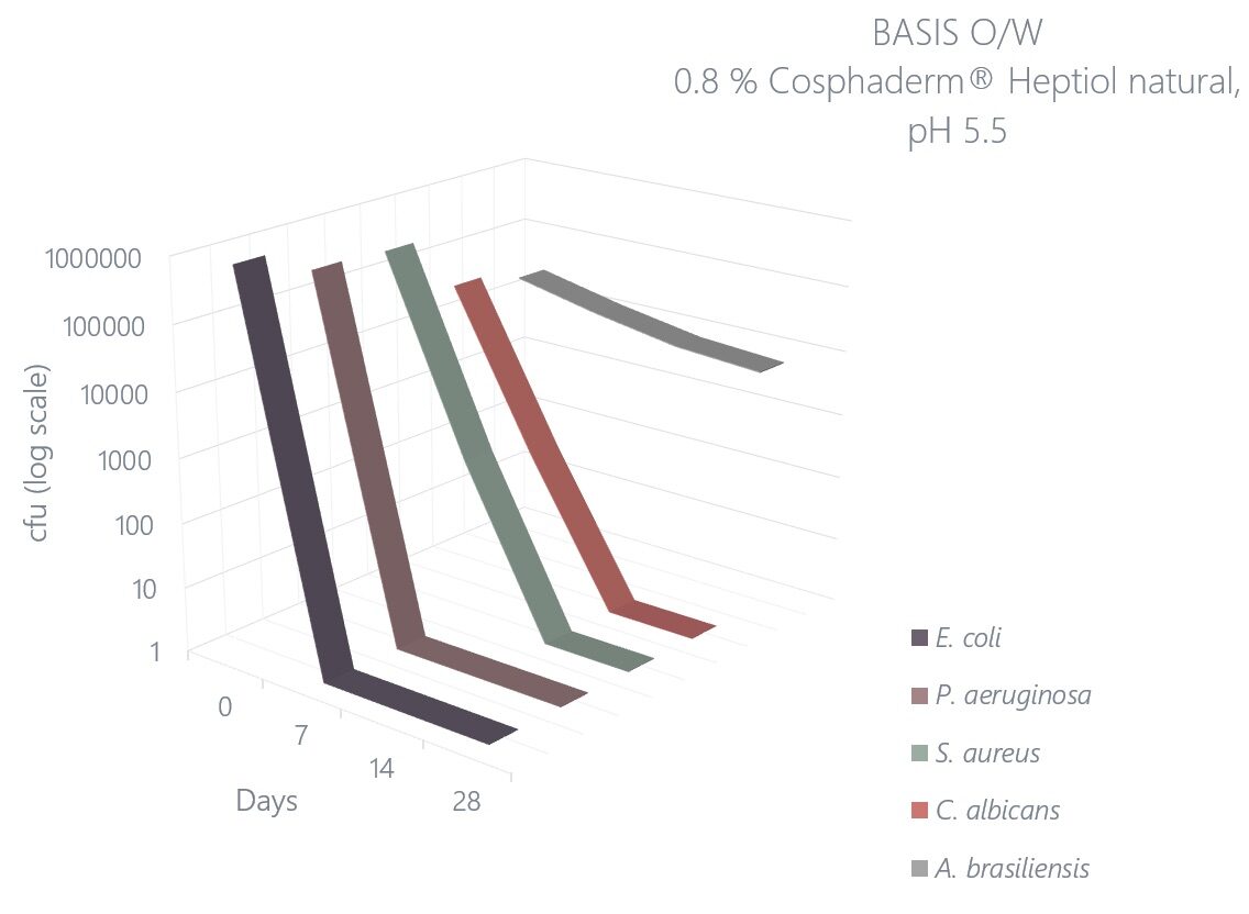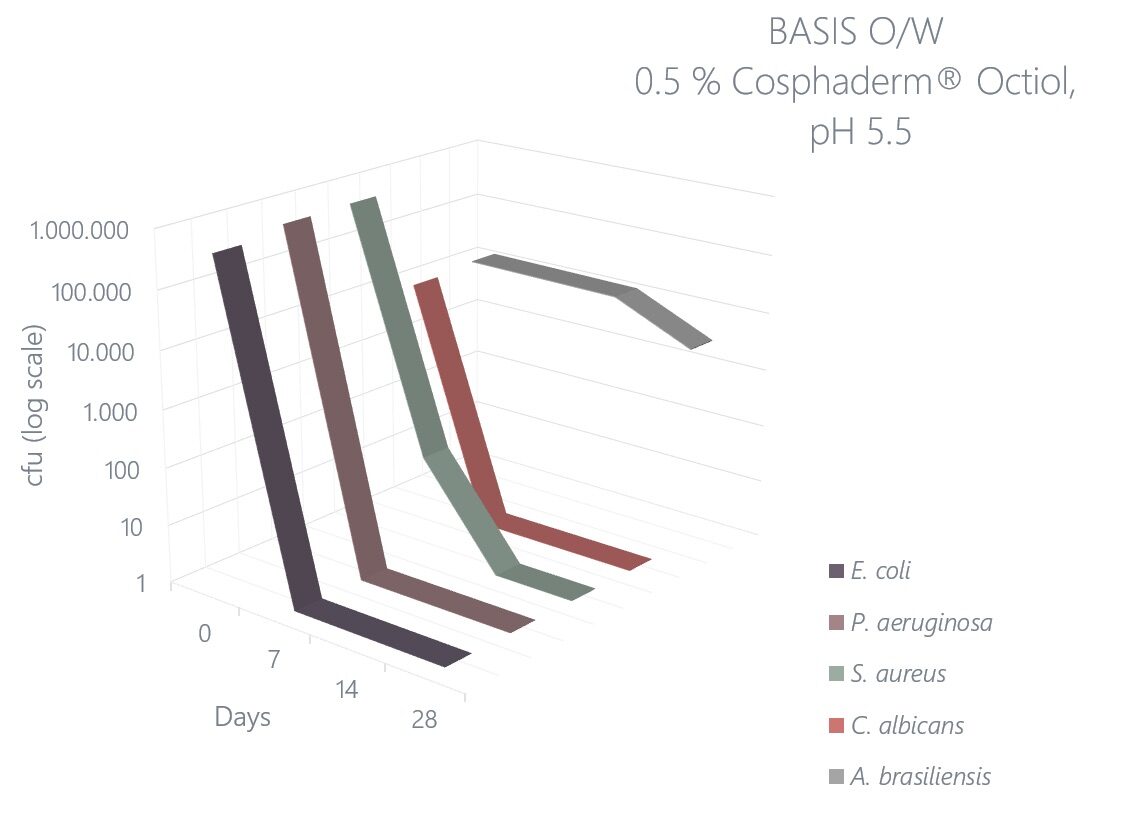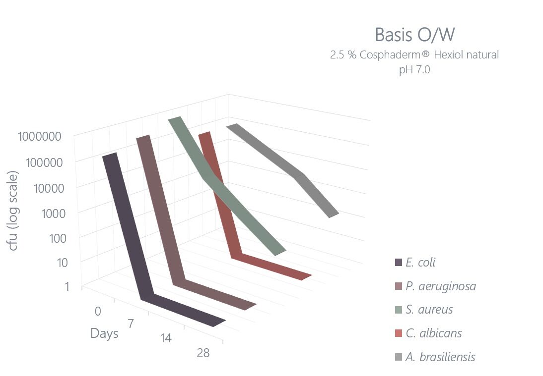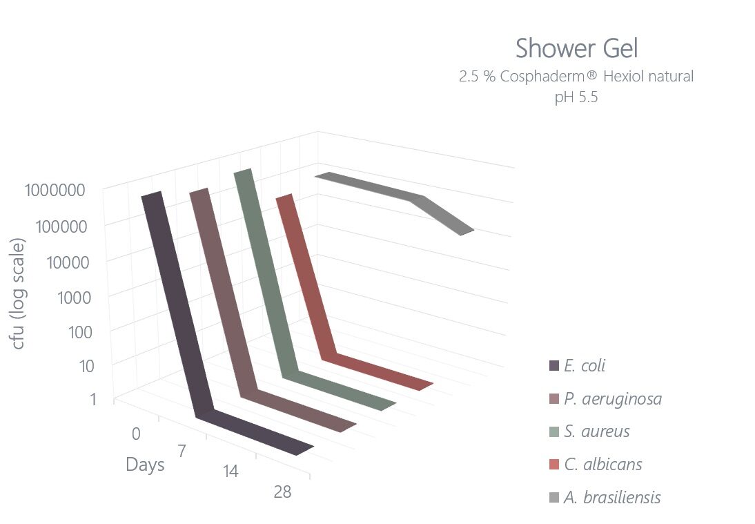 Like all diols in the Cosphatec portfolio, Cosphaderm® Hexiol natural pH-independent antimicrobial efficacy and suitable for a wide range of different formulation types. The antimicrobial efficacy at higher pH values (pH 7) and in a surfactant-based formulation (shower gel) can be seen in the following KBTs. Both challenge test were performed in accordance with ISO 11930 and passed with a B or A criterion.