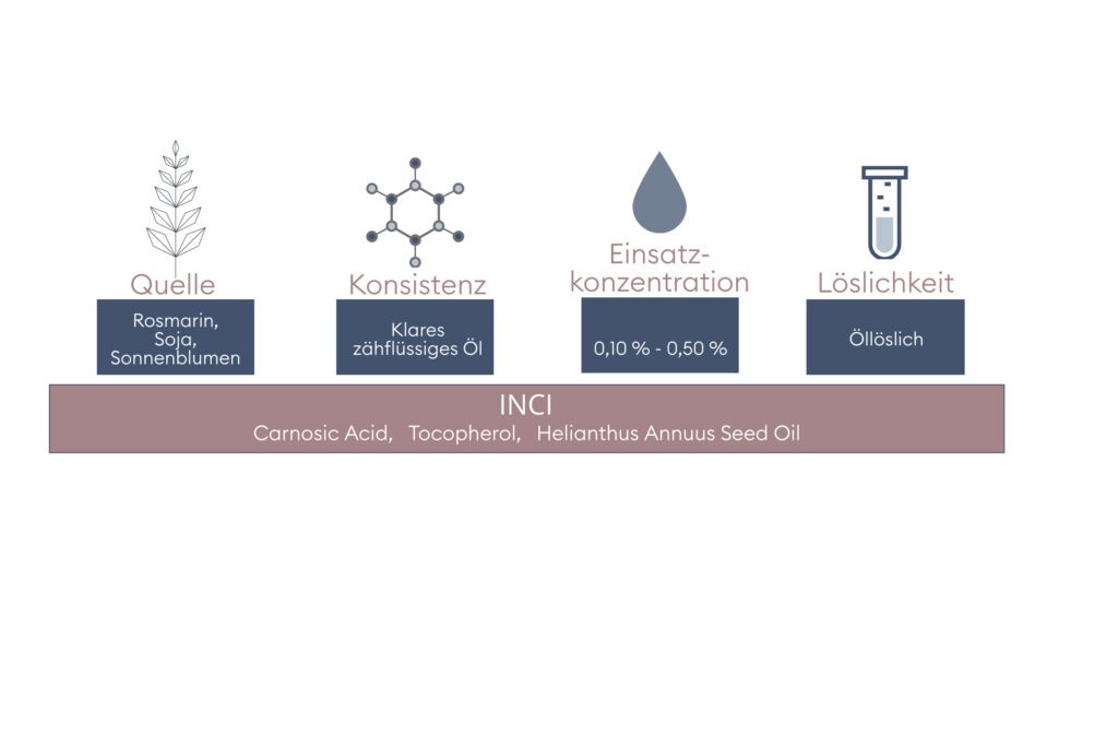 Cosphaderm® Tocopharin est composé d'antioxydants naturels, le tocophérol et l'acide carnosolique, dissous dans de l'huile de tournesol. Il s'agit d'un mélange d'antioxydants qui combine la protection de la phase huileuse de la formulation avec une influence positive sur les processus d'oxydation de la peau et qui, lorsqu'il est incorporé dans les formulations, n'en modifie ni l'odeur ni la couleur.